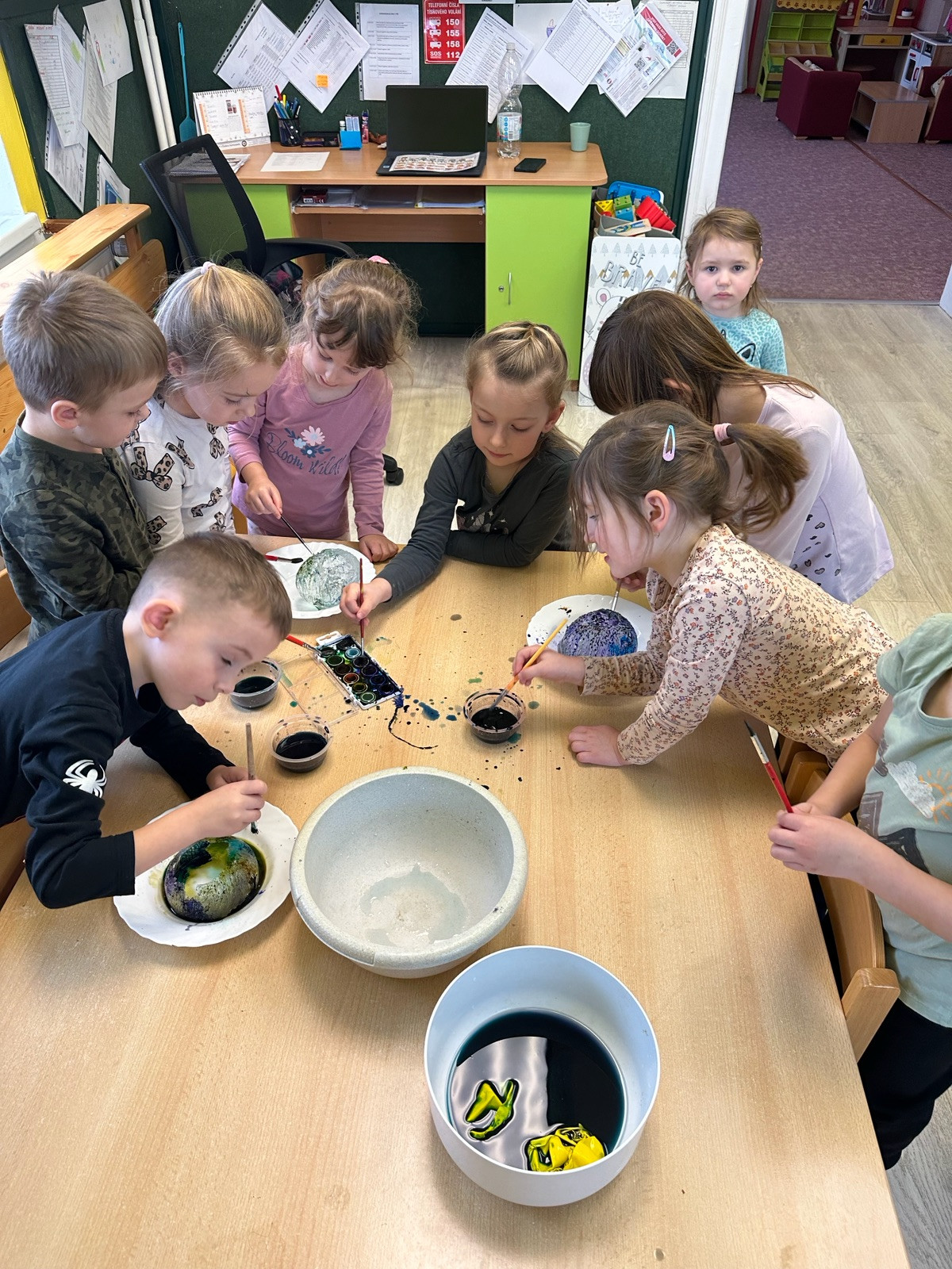 Předvelikonoční týden v naší školce provonělo těsto a rozzářily barvy! Naši malí pekaři se pustili do pečení mazanců s takovým nasazením, že by se i zkušené babičky divily. Kuchyní se linula vůně, která nás okamžitě naladila na svátky. Nezůstalo ale jen u pečení – barvili jsme vajíčka, ze kterých vznikly veselé zápichy do květináčů, a procvičili jsme si i týmovou spolupráci. Ve skupinkách jsme totiž skládali obří vajíčka z dřevěných kostek, což vyžadovalo pořádnou dávku trpělivosti a inženýrského umu!