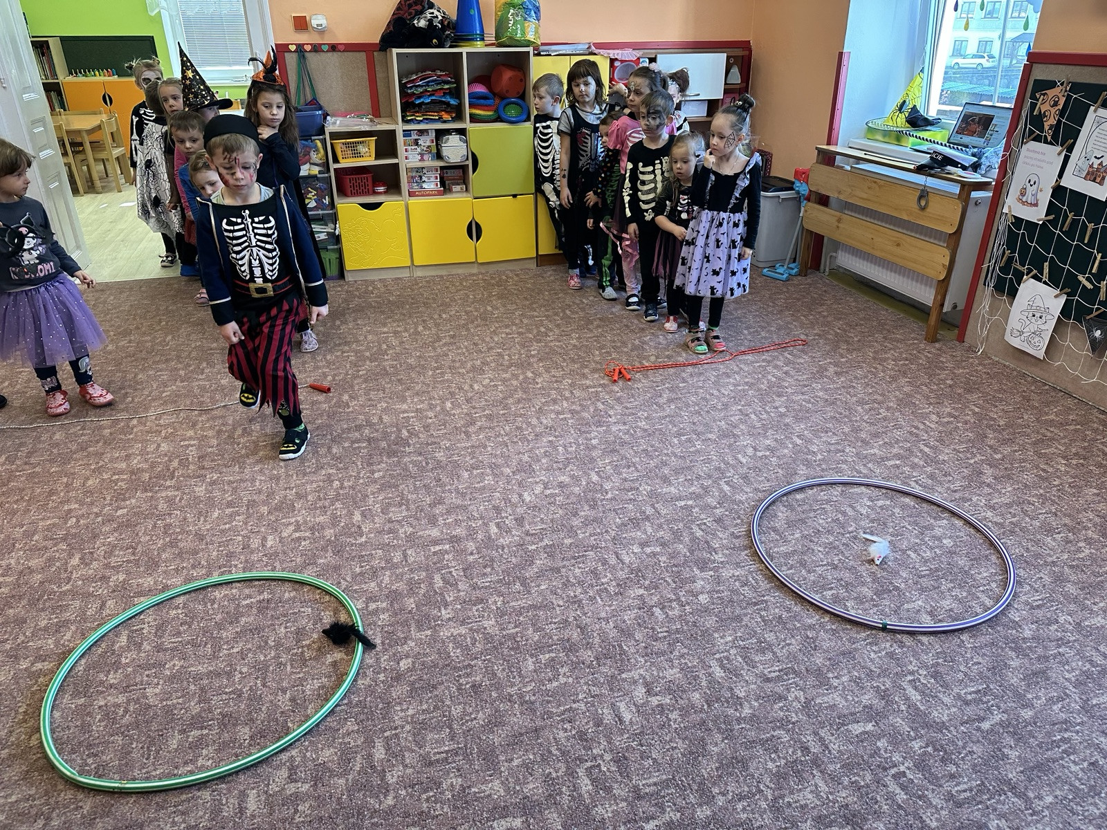 Páteční dopoledne v naší školce ovládla tajuplná, ale především veselá atmosféra, protože se naše sovičky proměnily v roztomilá strašidla, čarodějnice a tajuplné bytosti. Halloweenské oslavy jsme zahájili velkolepým rejem masek, při kterém nechybělo soutěžení v netradičních disciplínách prověřujících obratnost našich malých příšerek. Celou hernou zněla hudba, na kterou si děti s chutí zatancovaly, a radostný smích doprovázel každý splněný úkol.